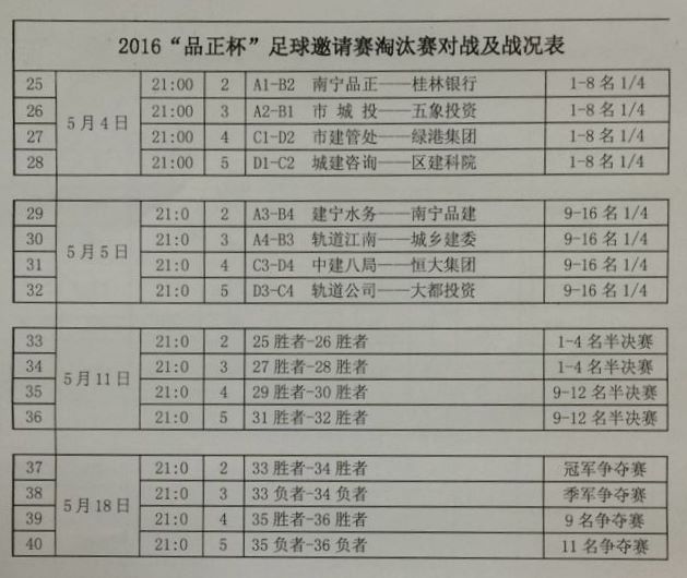1/4淘汰賽將于5月4日進(jìn)行,分別由A組第一南寧品正對(duì)B組第二桂林銀行、A組第二市城投對(duì)B組第一五象投資、C組第一市建管處對(duì)D組第二綠港集團(tuán)、C組第二區(qū)建科院對(duì)D組第一市城建咨詢。