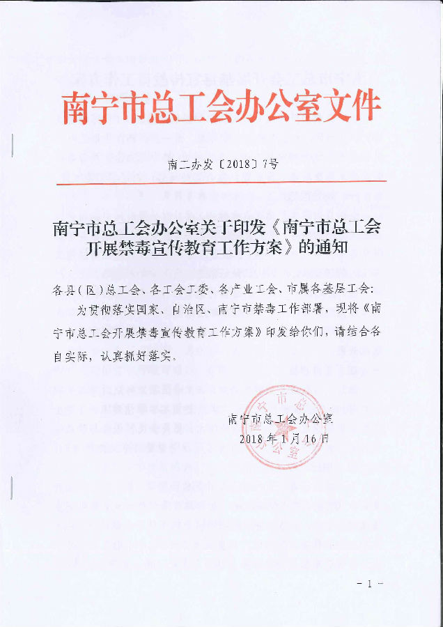 南寧市總工會(huì)辦公室關(guān)于印發(fā)《南寧市總工會(huì)開展禁毒宣傳教育工作方案》的通知