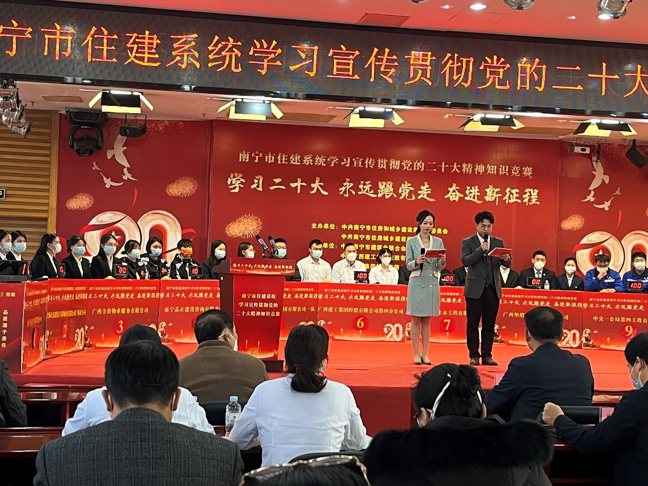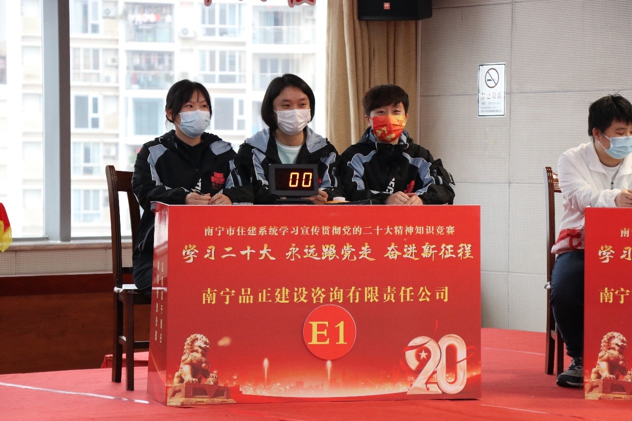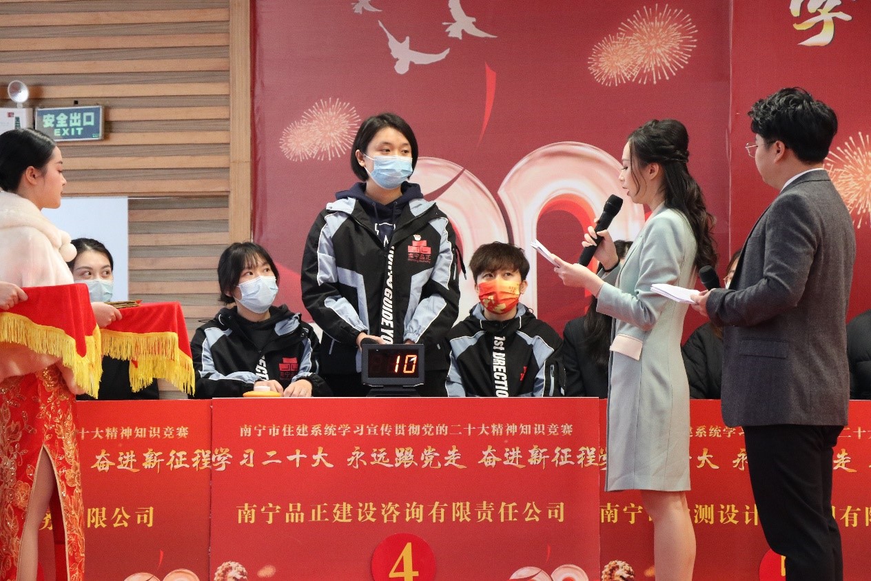 為深入宣傳貫徹黨的二十大精神,全面貫徹落實(shí)習(xí)近平總書記在大會期間的重要講話,深刻領(lǐng)悟“兩個(gè)確立”的決定性意義,增加“四個(gè)意識”、堅(jiān)定“四個(gè)自信”、做到“兩個(gè)維護(hù)”,引導(dǎo)廣大干部群眾認(rèn)真學(xué)習(xí)領(lǐng)悟黨的二十大提出的新思想、新部署、新要求,通過以賽促學(xué),以賽促用,營造濃厚學(xué)習(xí)氛圍。2023年1月5日、6日,黨員何卉芷、入黨積極分子張藝梅、青年代表覃夏代表品正黨支部參加了由南寧市住建設(shè)行業(yè)黨委舉辦的“學(xué)習(xí)宣傳貫徹黨的二十大精神”知識競賽。取得了第三名的好成績。