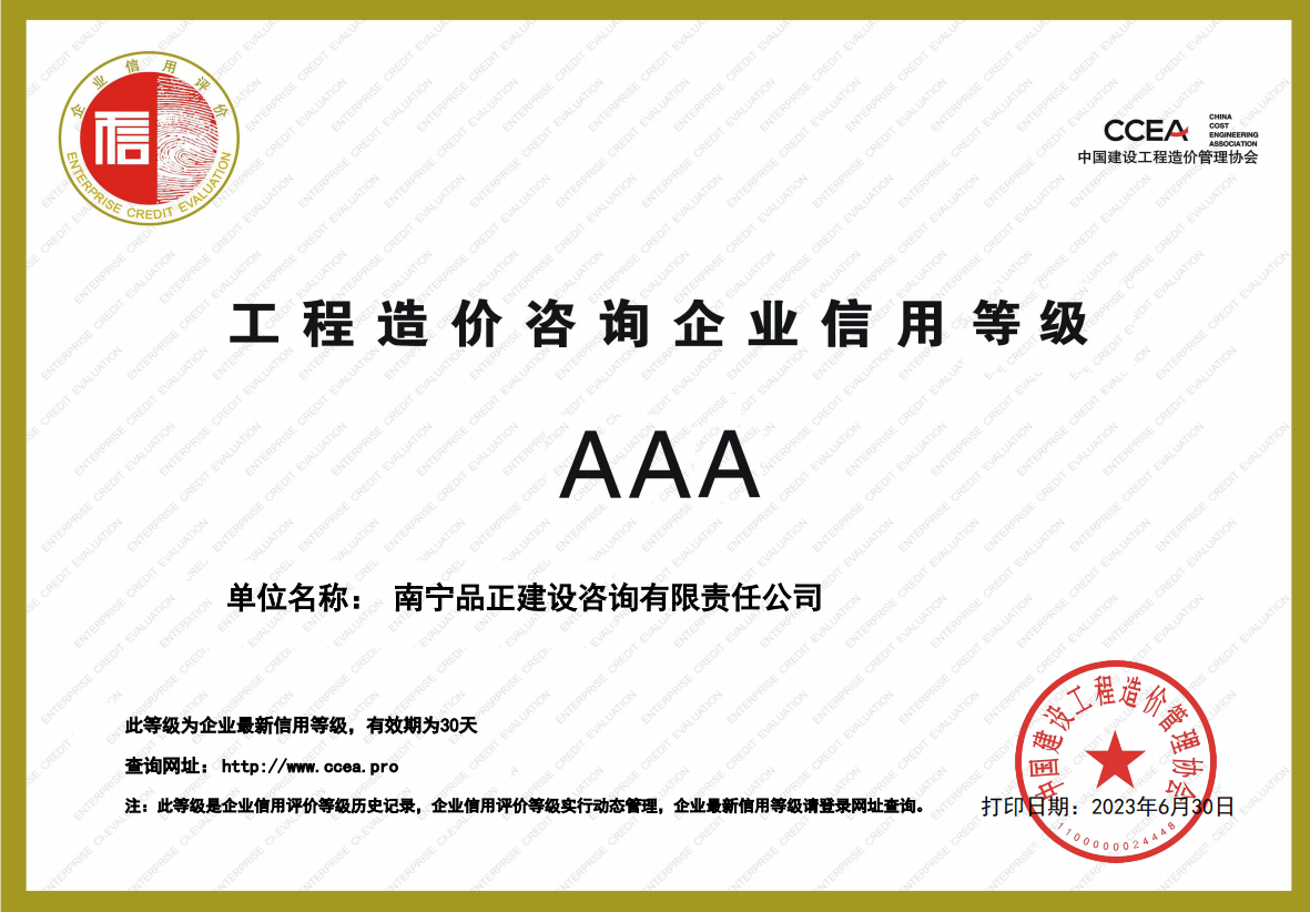 2023年3月至6月,南寧品正建設咨詢有限責任公司參加中國建設工程造價管理協會組織的2023年第一批工程造價咨詢企業(yè)信用評價,順利通過初評、終評,榮獲中國建設工程造價管理協會最高等級AAA級信用等級(中價協〔2023〕40號文),我公司自2017年以來,已經連續(xù)6年獲此殊榮。