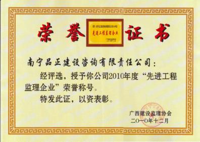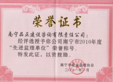 2010年12月,南寧品正獲得廣西建設(shè)監(jiān)理協(xié)會(huì)、南寧市建設(shè)監(jiān)理協(xié)會(huì)分別頒發(fā)的廣西2010年度“先進(jìn)工程監(jiān)理企業(yè)”、南寧市2010年度“先進(jìn)監(jiān)理單位” 榮譽(yù)稱號(hào)。公司總工程師陳秋獲得廣西“優(yōu)秀總監(jiān)理工程師” 榮譽(yù)稱號(hào),盧天昌、萬(wàn)立名獲得廣西“優(yōu)秀監(jiān)理工程師”榮譽(yù)稱號(hào)。陳秋、張學(xué)群、曾振華、馮人杰、萬(wàn)立名獲得南寧市“優(yōu)秀總監(jiān)理工程師”榮譽(yù)稱號(hào)。姚思清、黃燕玲、賴建華、李風(fēng)雷、盧天昌獲得南寧市“優(yōu)秀監(jiān)理工程師”稱號(hào)。
