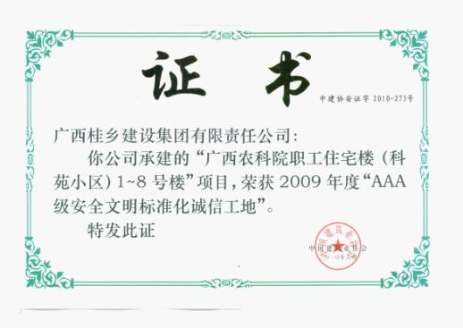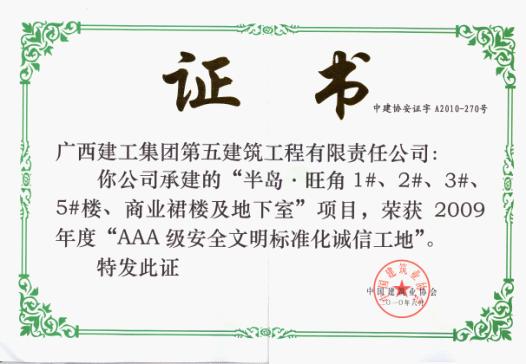 2010年6月,南寧品正負責監(jiān)理的半島·旺角1#2#3#5#樓及商業(yè)裙樓及地下室、廣西農(nóng)科院職工住宅樓(科苑小區(qū))工程榮獲中國建筑業(yè)協(xié)會頒發(fā)的 “AAA級安全文明標準化誠信工地”稱號。